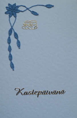 Onnittelukortti poikavauvalle kastepäivänä nyplätyllä pitsillä. Kaksiosainen, koko 10 x 14,8 cm, sisäpuolella ei ole kirjoitusta. Toimitus 2-3 vrk.