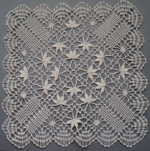 Nyplätty ½-valkaistusta pellavalangasta. Koko on 26 x 26 cm. Tämä on tilauksesta valmistettava tuote ja toimitusaika on 1-2 viikkoa.